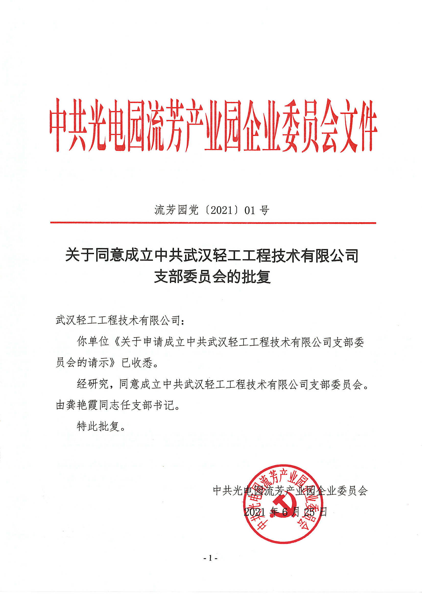 2021年6月30日下午2點,中共光電園流芳產(chǎn)業(yè)園企業(yè)委員會黨辦書記江峰、黨辦委員李偉、黨辦專員李曉葉一行三人到我公司宣布了關(guān)于同意成立中共武漢輕工工程技術(shù)有限公司支部委員會的決定。